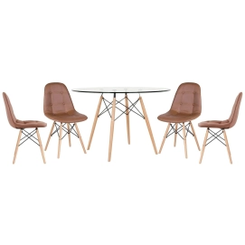 Mesa Eames com tampo de vidro 120 cm + 4 cadeiras estofadas Eiffel Botonê - Marrom